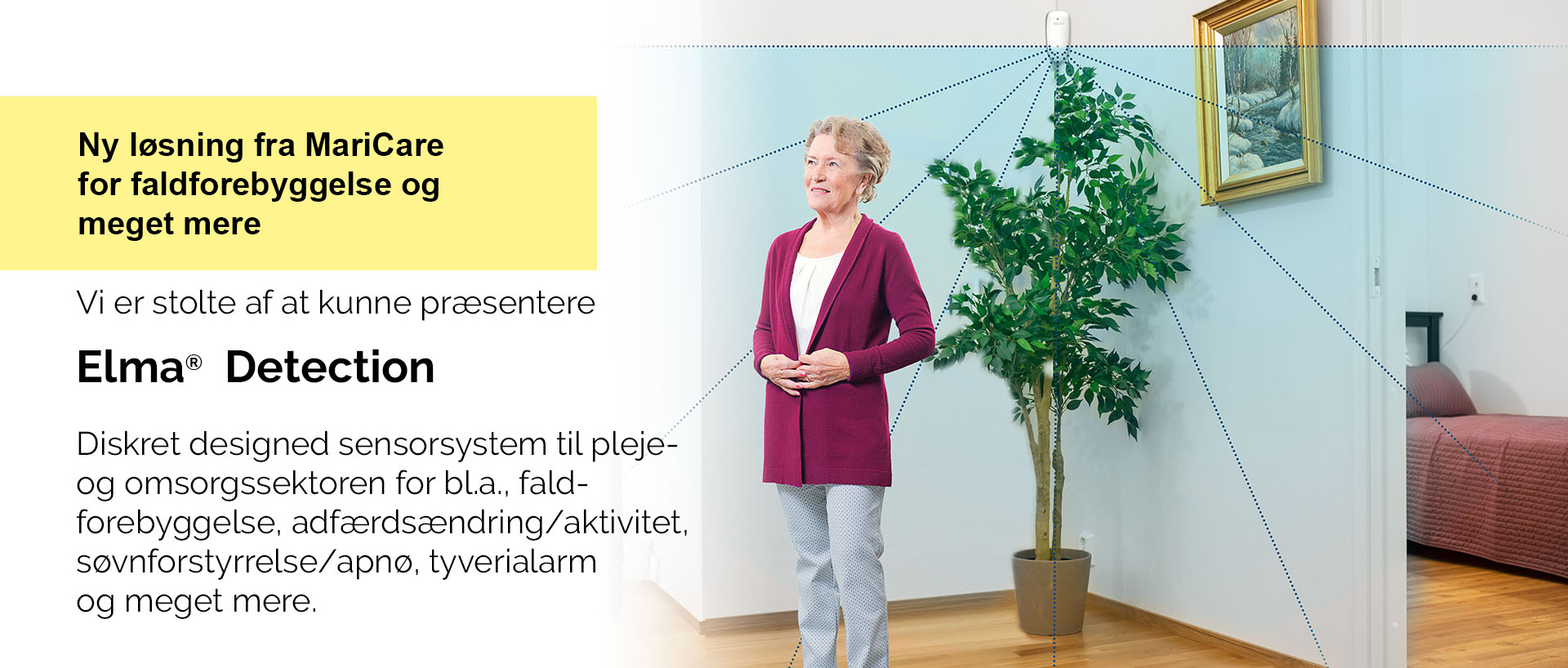 Elma® Detection er et unikt sensorsystem med fokus på, faldforebyggelse, søvnforstyrrelse/apnø overvågning, tryksår forebyggelse, adfærdsændringer og tyverialarm.